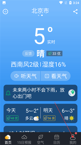1、在天气主界面,点击底部“我的”选项,进入个人中心页面。