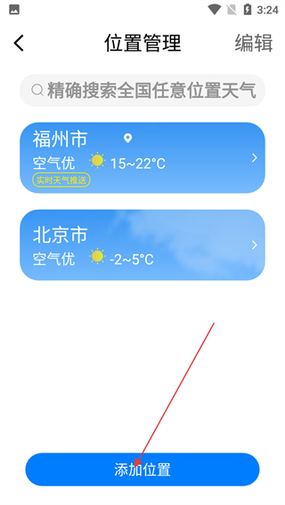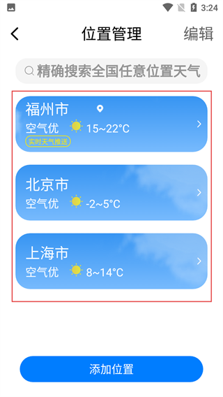 4、选中城市后,返回位置管理页,即可查看该城市的天气信息,完成位置添加流程。