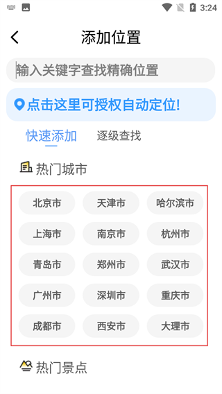 3、在添加位置界面,可通过搜索框输入城市名,或从热门城市列表(如上海市)中选择目标城市。