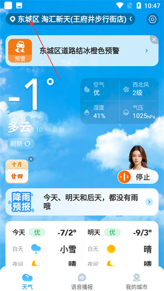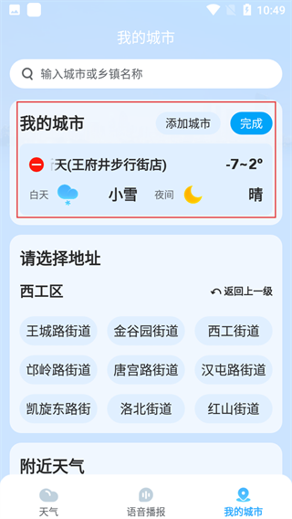 1、在应用主界面,点击顶部显示的当前城市区域,进入“我的城市”页面。