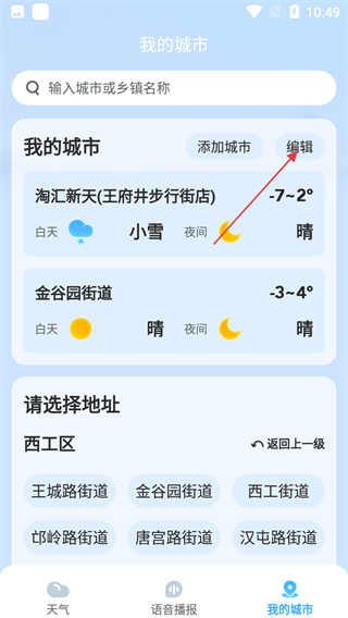 2、在“我的城市”页面,点击右上角的【编辑】按钮,进入城市编辑状态。