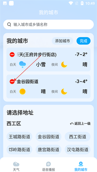 4、选择需删除的城市后,点击右上角的【完成】按钮,即可完成城市的删除,“我的城市”列表将更新为剩余城市。
