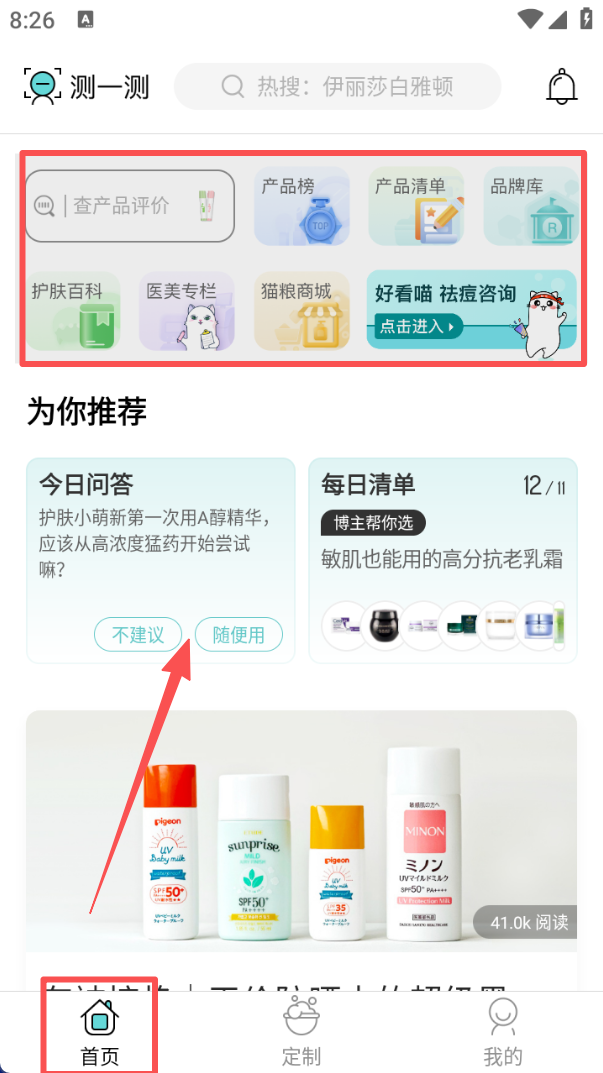 1、进入首页,在功能区选择护肤百科、医美专栏等服务,也能参与今日问答获取护肤建议。