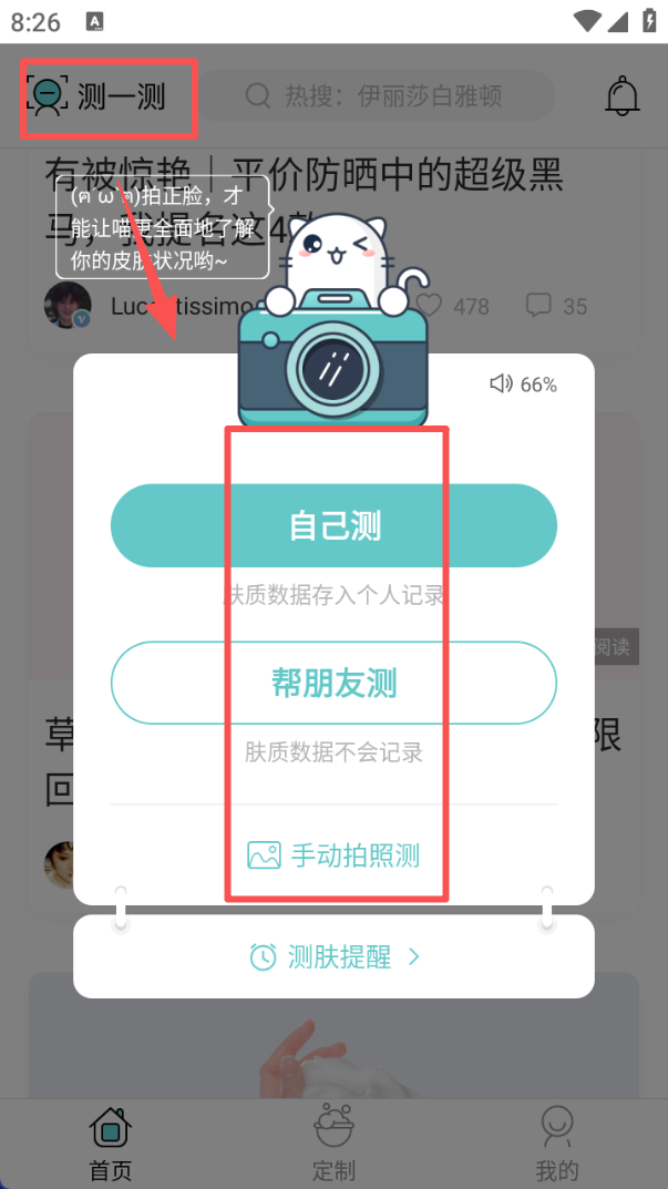 2、点击 “测一测”,选择自己测、帮朋友测等方式,完成肤质检测并记录相关数据。