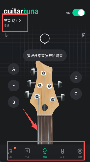 3、进行调音,根据显示的吉他图示,弹拨琴弦并调整至正确音调。