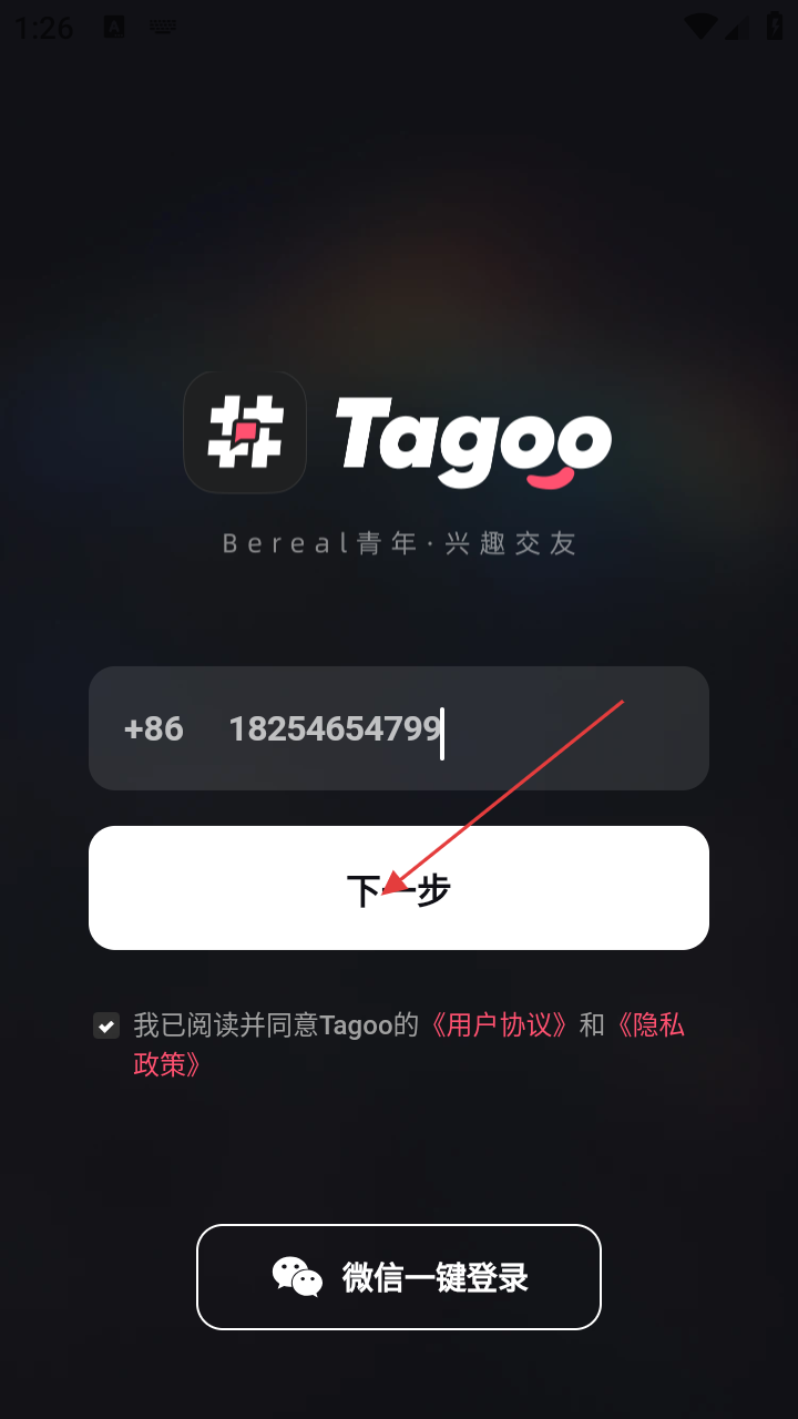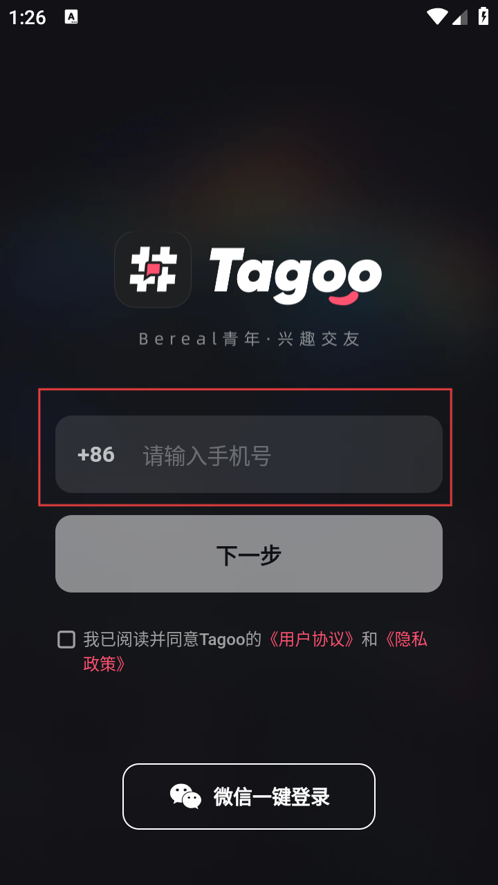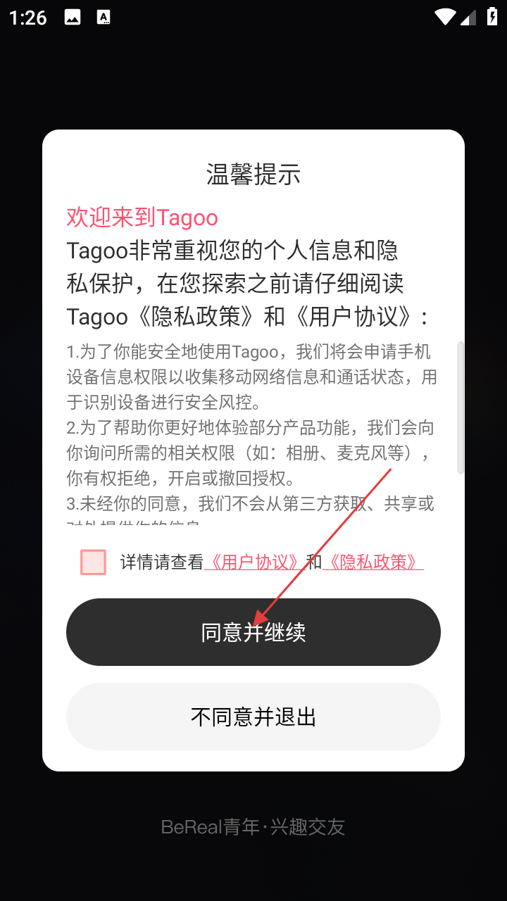 1、首次使用Tagoo,需阅读并理解《用户协议》和《隐私政策》,点击【同意并继续】,进入登录页面。