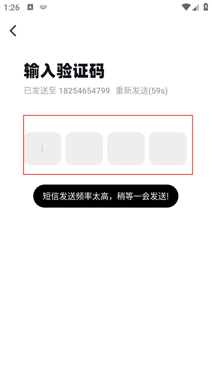 4、在验证码输入页面,输入收到的验证码,若发送频率高,稍等片刻再获取,输入后完成登录流程。