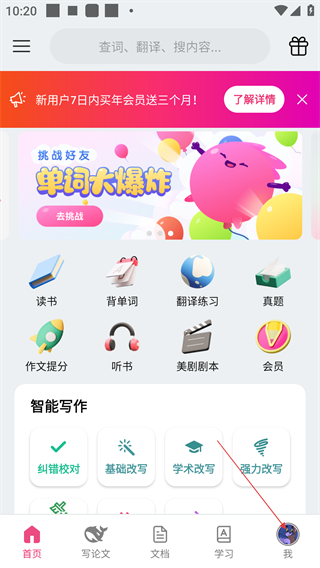 1、进入应用首页后,可通过【读书】【背单词】等功能学习,也能参与【单词大爆炸】挑战好友,点击底部【我】进入个人中心。