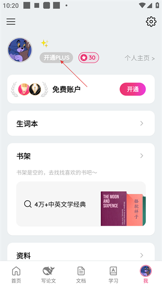 2、在个人中心页面,可查看【生词本】【书架】,还能点击【开通PLUS】进入会员开通界面,拓展功能权限。