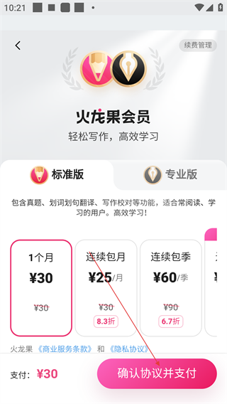 3、进入【火龙果会员】页面,选择【标准版】等套餐,确认金额后点击【确认协议并支付】,即可开通会员服务。