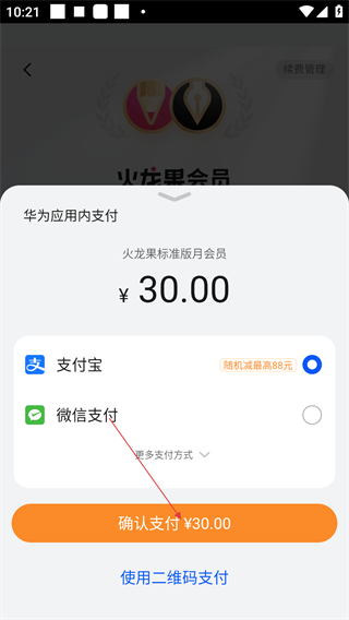 4、支付环节可选择【支付宝】【微信支付】等方式,选定后点击【确认支付¥30.00】完成会员购买流程。