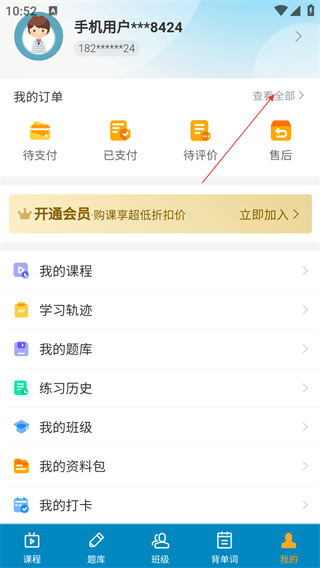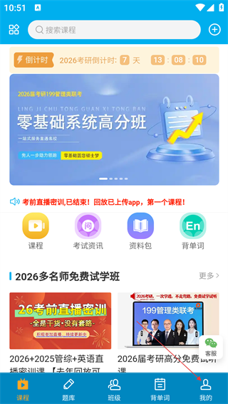 1、在考研学习类APP的首页,点击底部导航栏的【我的】,进入个人中心页面。
