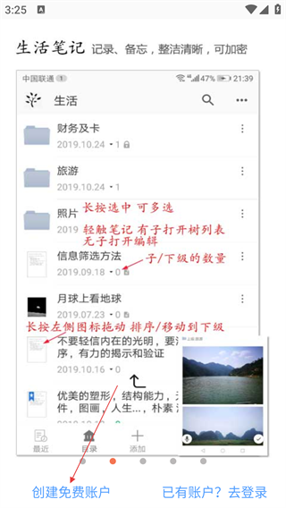 2、在主界面,可通过“长按选中”“轻触笔记”等操作管理笔记,也可点击【创建免费账户】进入注册页。