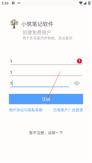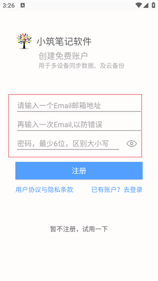 4、填写信息后点击【注册】,完成账户创建,即可使用多设备同步、云备份等功能;也可选择“暂不注册,试用一下”直接体验基础功能。
