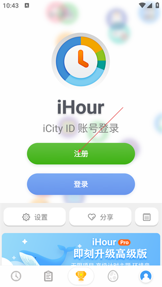 1、在iHour主界面,点击右下角人形图标,可进入账号登录注册界面,以便使用账号功能。