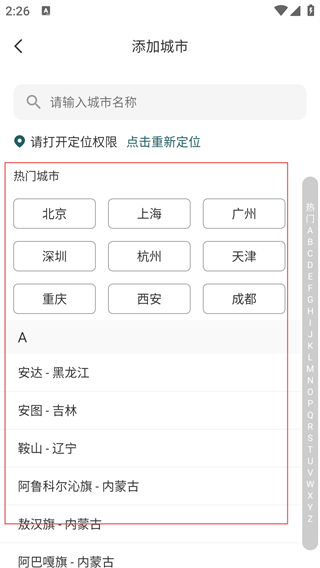 3、在添加城市界面,可通过搜索框输入城市名,或从热门城市列表(如北京、上海)中选择目标城市。