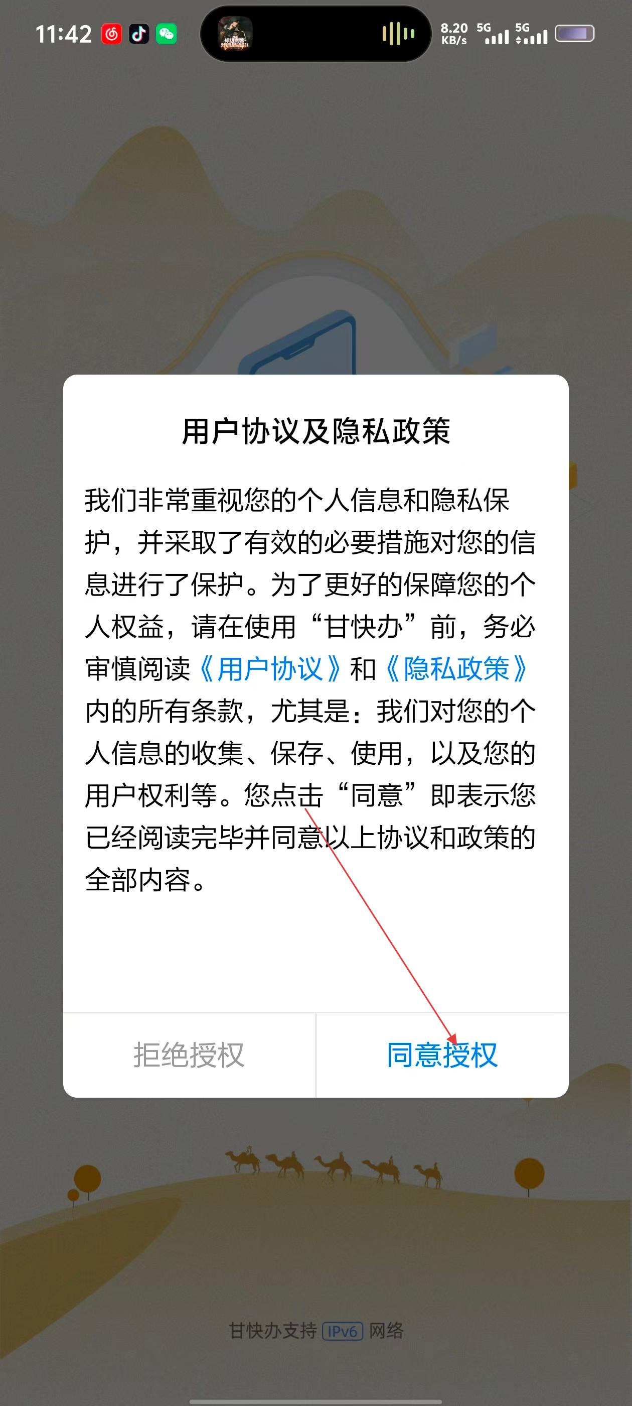 1、打开“甘快办”APP,会弹出【用户协议及隐私政策】弹窗,点击【同意授权】,进入APP主界面。