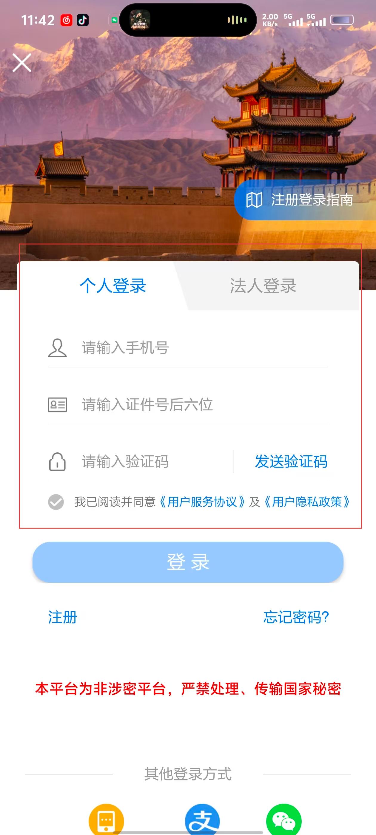 4、在登录界面,选择个人登录,输入手机号、证件号后六位,获取并输入验证码,点击【登录】按钮完成登录。