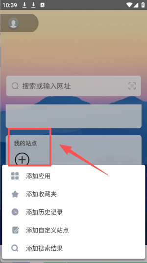 2、点击“我的站点”并选择“添加”选项,自定义您的浏览器首页。