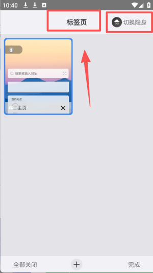 4、在标签页管理中,点击“切换隐身”以保护您的隐私。