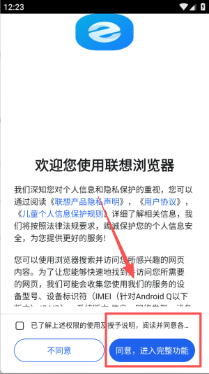 1、阅读隐私声明点击“同意,进入完整功能”,授权设备标识符收集权限。