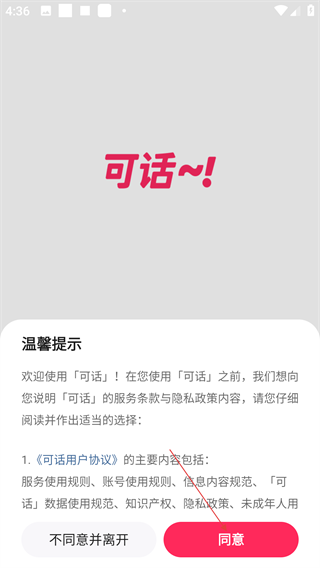 1、打开【可话】应用,需阅读【服务条款】与【隐私政策】,点击底部【同意】按钮方可进入后续流程。
