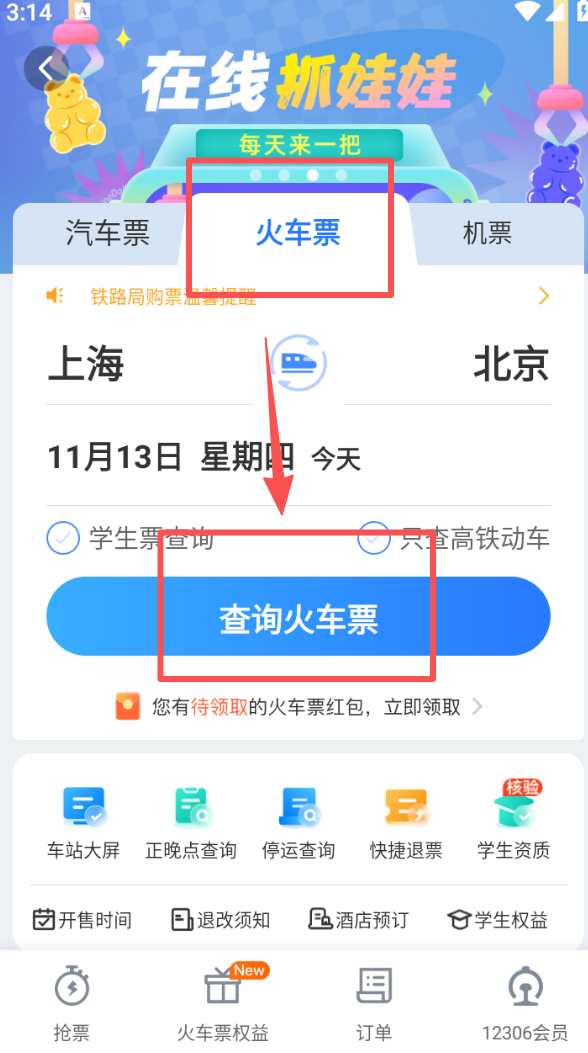 2、在火车票板块,确认出发地上海、目的地北京及出行日期后,点击 “查询火车票” 按钮。
