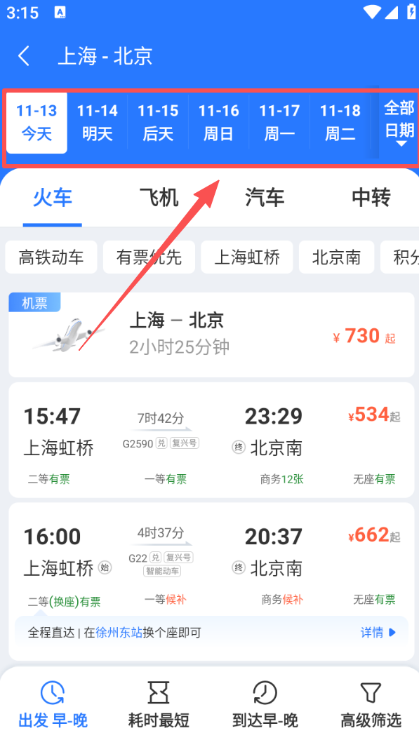 3、在查询结果页,可根据需求选择具体出行日期,查看对应车次信息。