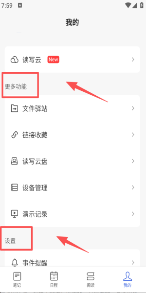 4、进入“我的”使用读写云与文件驿站,多端同步笔记与收藏链接。