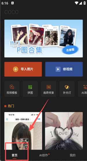 2、在首页点导入照片或修视频,选热门模板即可一键开启高清拼图修复。