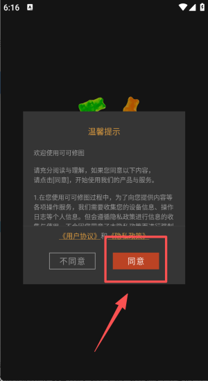 1、阅读温馨提示后点同意,授权设备信息与日志收集以启用完整修图服务。