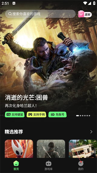 1、在【格来云游戏】首页,可浏览推荐游戏(如《消逝的光芒:困兽》),点击底部【我的】进入个人中心。
