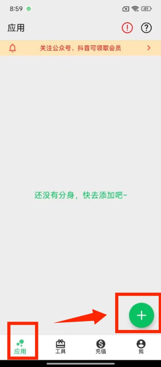 1、进入应用页面,点击右下角绿色加号按钮,可添加应用分身,完善当前的应用配置。