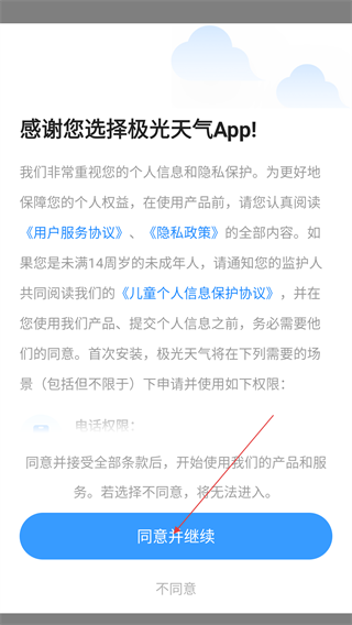 1、首次打开App,阅读《用户服务协议》《隐私政策》等条款后,点击“同意并继续”,进入应用主界面。