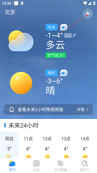 2、主界面默认显示当前城市(如北京)的天气信息,点击右上角“+”按钮,进入城市添加页面。