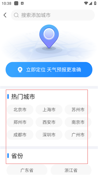 3、在城市添加页,可通过定位、搜索或选择热门城市(如上海市)来添加新城市。