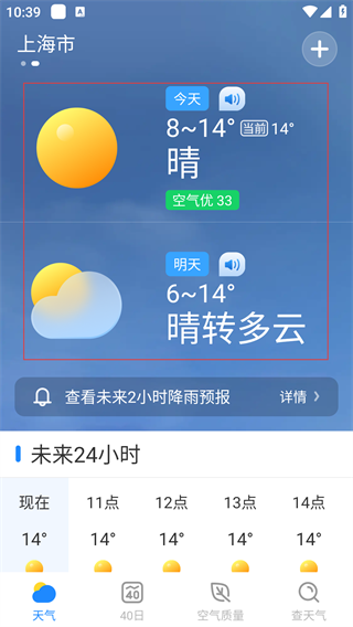 4、添加后返回主界面,即可查看新城市(如上海)的实时天气、未来预报等信息。