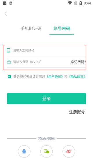 3、进入登录界面,点击【账号密码】进入账号密码登录界面。