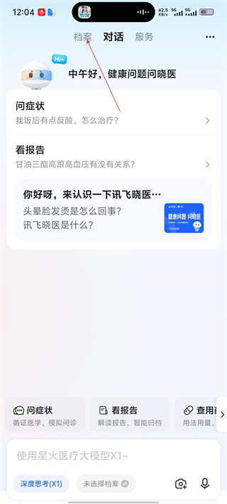 1、在【讯飞晓医】的对话页面,可通过【问症状】【看报告】等功能咨询健康问题,也能切换至【档案】页管理健康信息。