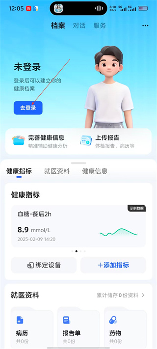 2、进入【档案】页后,未登录状态下点击【去登录】可开启健康档案功能,支持完善健康信息、上传报告等操作。