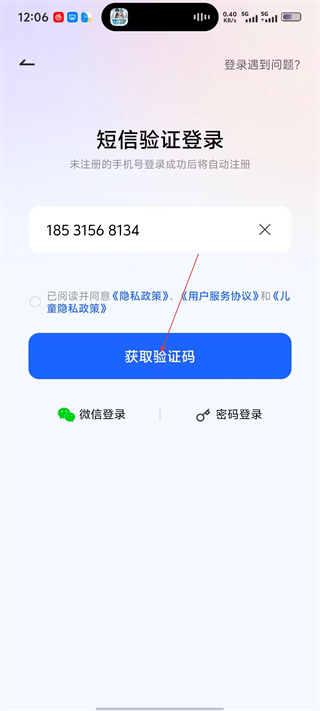 4、填写手机号并勾选协议后,点击【获取验证码】按钮,即可接收短信验证码,推进登录流程完成账号验证。