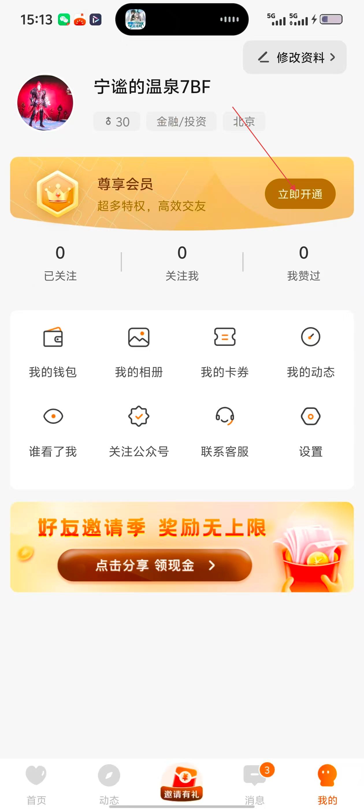 3、进入个人页面后,若想开通尊享会员,点击【立即开通】,进入会员开通相关页面。