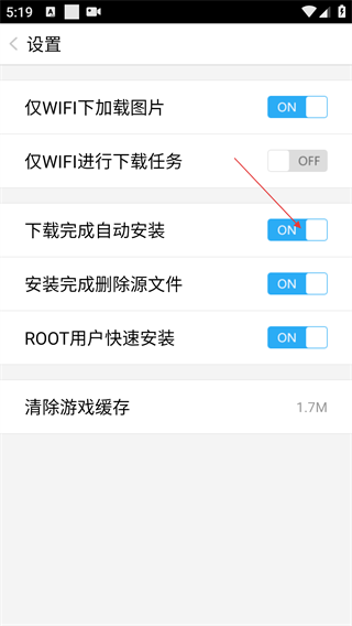 3、在【设置】页面中,可根据需求调整【下载完成自动安装】等功能的开关状态,当前该功能处于【ON】开启状态。