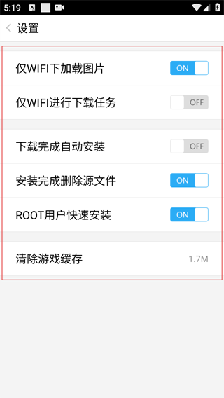 4、在【设置】页面,可统一管理多个功能开关,如将【下载完成自动安装】切换为【OFF】关闭状态。