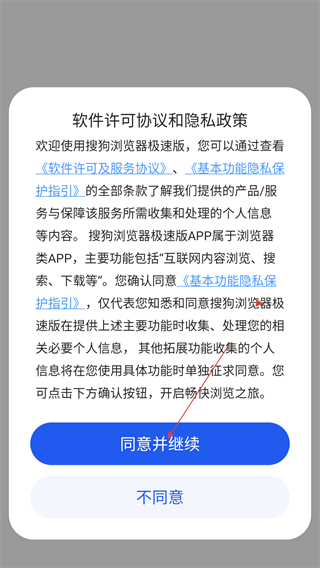 1、在搜狗浏览器极速版软件许可协议和隐私政策弹窗中,点击【同意并继续】,接受相关协议,即可进入浏览器主界面。