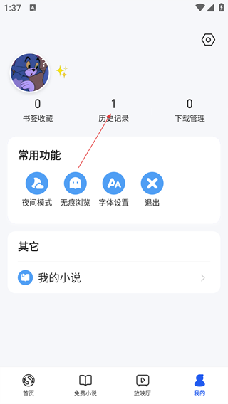 2、在浏览器主界面,点击底部【我的收藏】,进入个人中心页面,可查看历史记录和进行功能设置等操作。