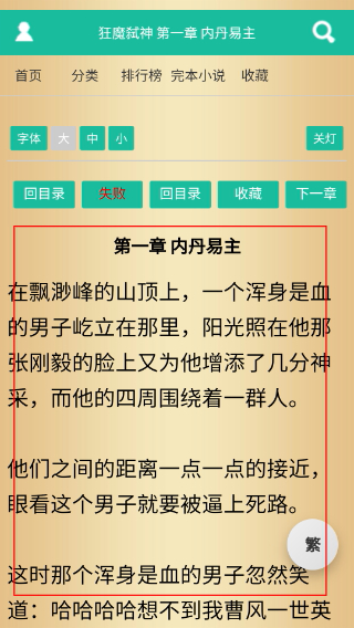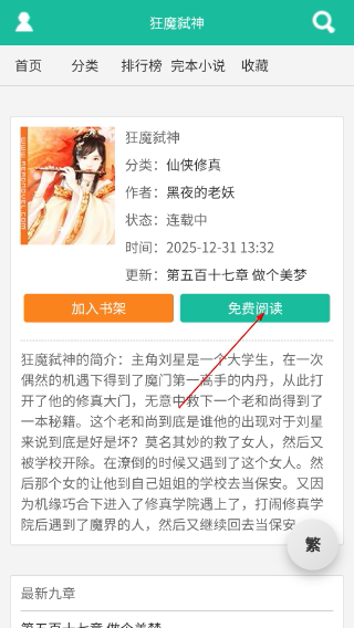 1、打开小说应用,进入“仙侠修真”分类页面,选择目标小说(如《狂魔弑神》),进入小说详情页。