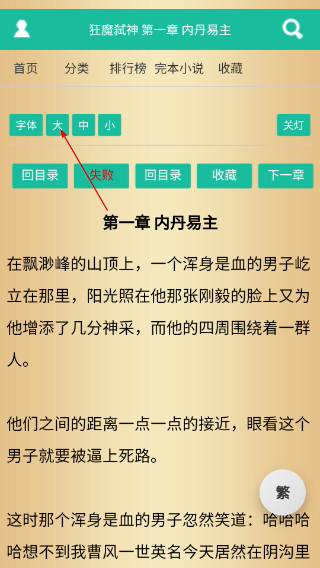 3、在阅读页面,可通过顶部的“字体”选项(大/中/小)调整文字大小,通过“关灯/开灯”切换阅读背景模式。