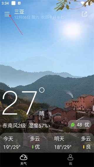 1、在三亚天气主界面,点击左上角菜单按钮,进入“我的城市”页面。