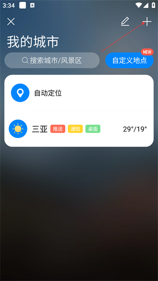 2、在“我的城市”页,点击右上角“+”按钮,进入城市搜索界面,可通过搜索框或热门城市列表选择目标城市。
